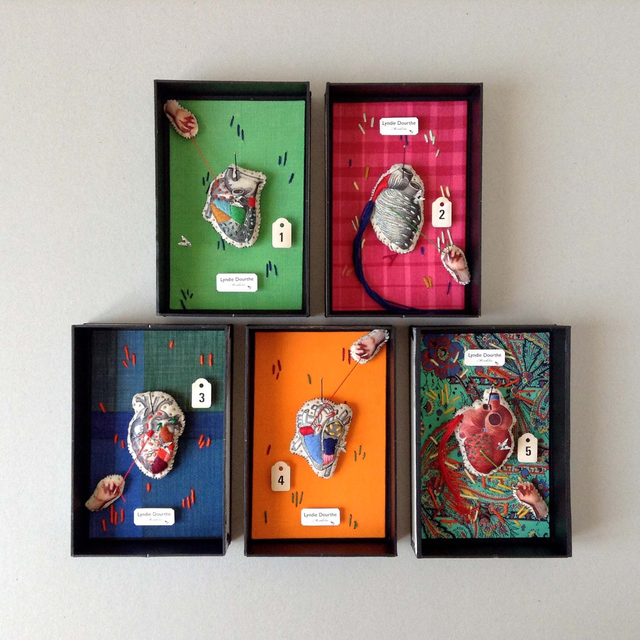 Fond coton coloré, contre-collé et rebrodé. Impression du coeur : transfert sur toile de coton + rembourrage + broderie..