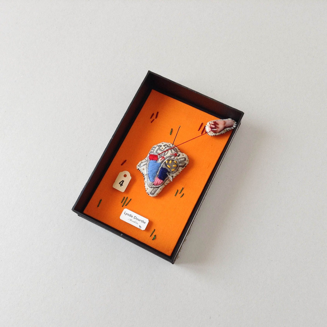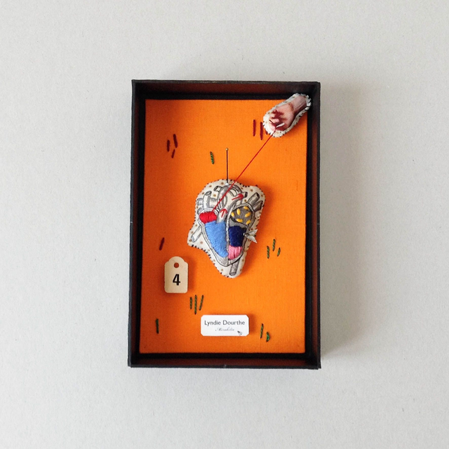 Pièce unique présentée dans une boîte vitrée décorative en carton, recouverte de papier reliure noir, faite-main par mes soins.