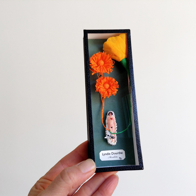 Pièces uniques présentées dans une boîte décorative vitrée en carton, recouverte de papier reliure noir, faite-main par mes soins.
