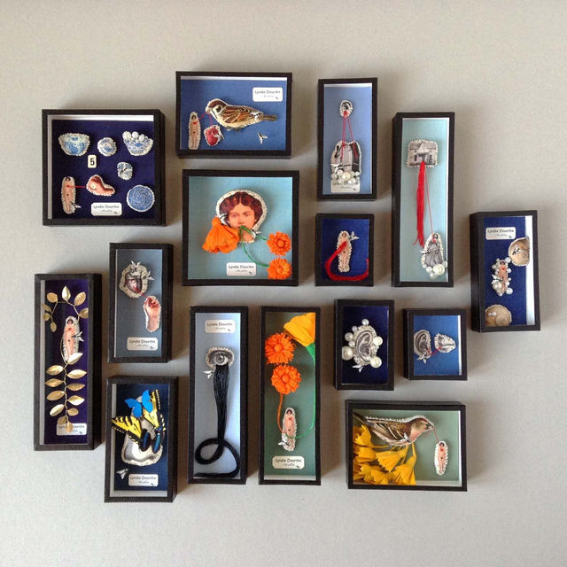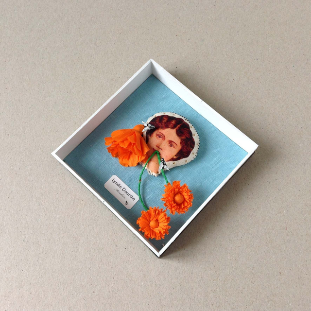 Pièces uniques présentées dans une boîte décorative vitrée en carton, recouverte de papier reliure noir, faite-main par mes soins.