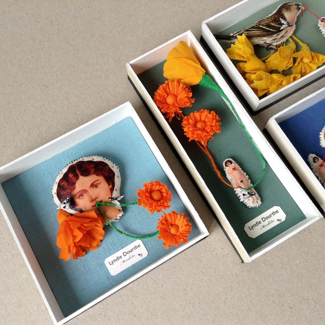 Matériaux : carton / verre / textile / papier / épingles.
