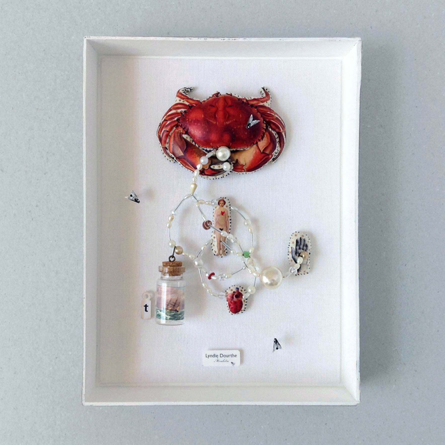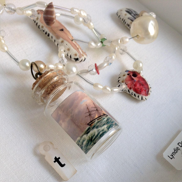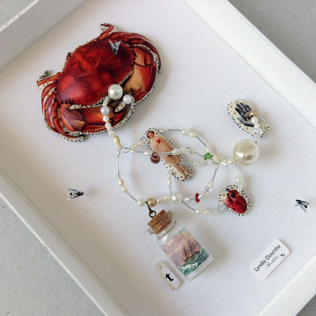 Matériaux : carton / verre / textile / perles diverses de culture, nacre, verre, cristal, fantaisie... / fil métal / flacon en verre / épingles...