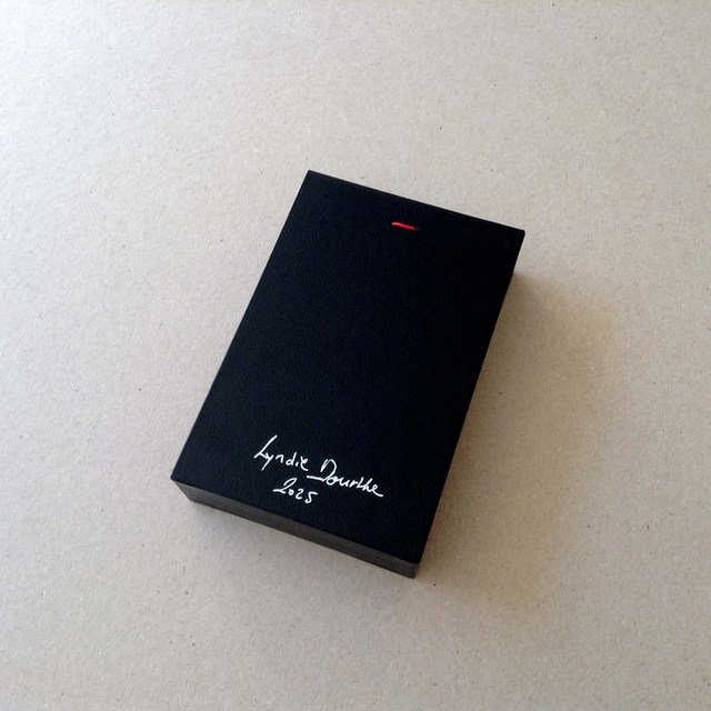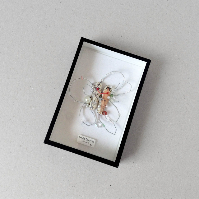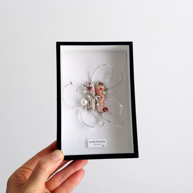 Pièce unique présentée dans une boîte vitrée décorative en carton, recouverte de papier reliure noir, faite-main par mes soins.