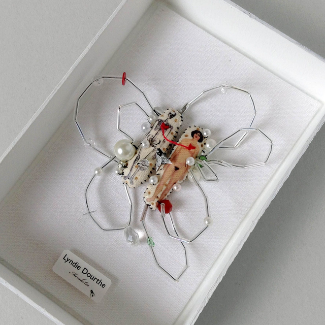 Matériaux : carton / verre / textile / perles diverses de culture, de nacre, de verre, de cristal, fantaisie... / fil métal / épingles...