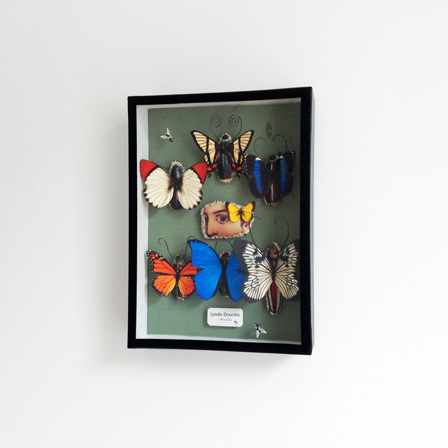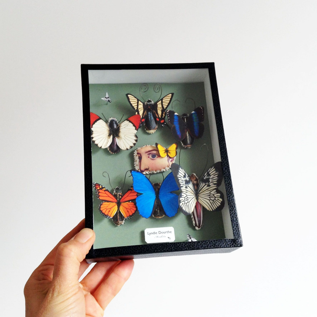 Pièce unique / Présentation dans une boîte décorative vitrée en carton, recouverte de papier reliure noir, faite-main par mes soins.