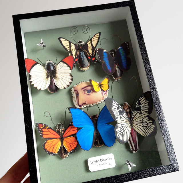 Fond coton ‘vert argile’ contre-collé / Impression des illustrations : transfert sur toile de coton + rembourrage / Papillon : impression sur papier.