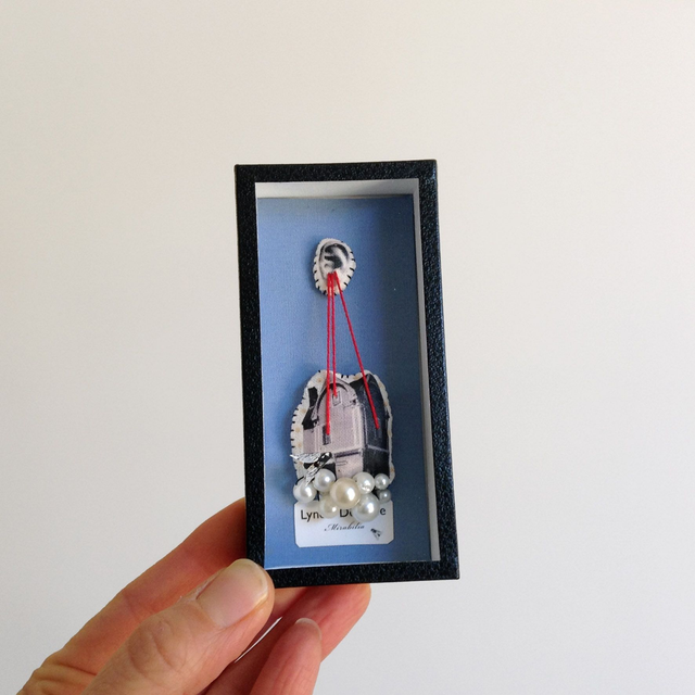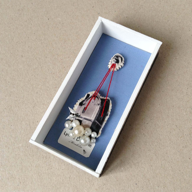 Pièce unique présentée dans une boîte décorative vitrée en carton, recouverte de papier reliure noir, faite-main par mes soins.