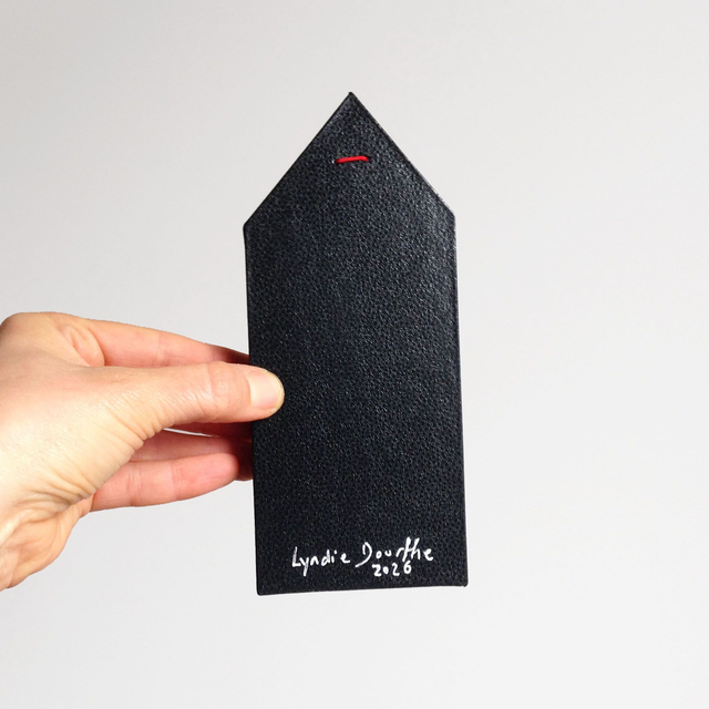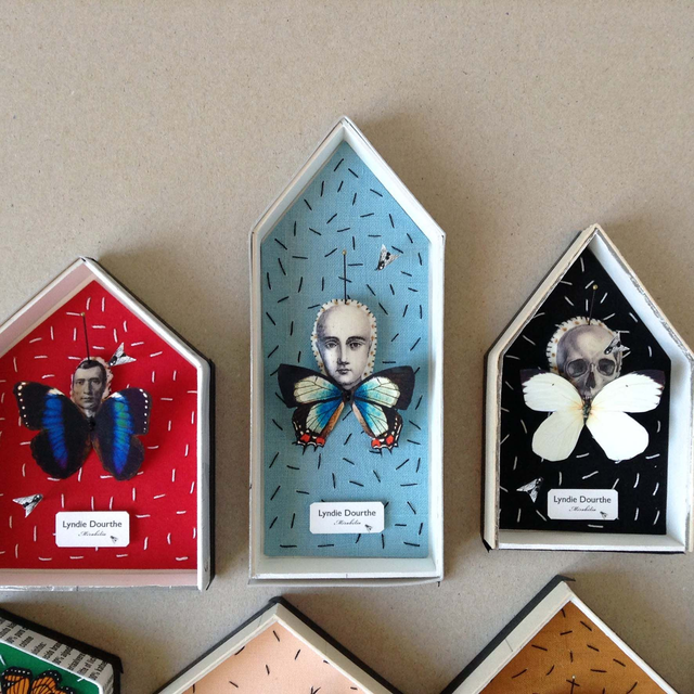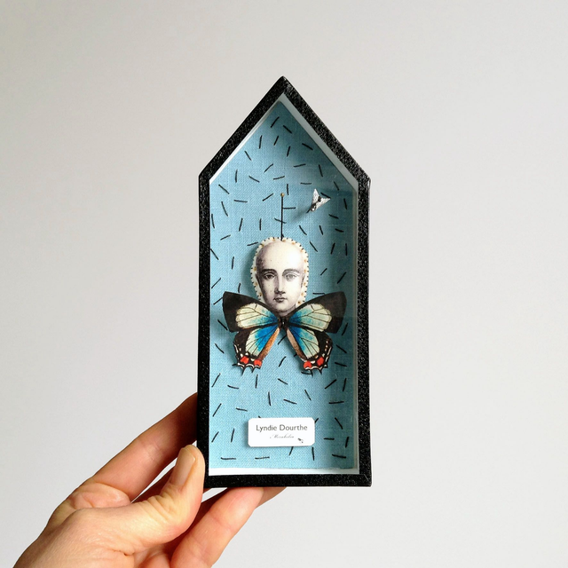 Pièce unique présentée dans une boîte décorative vitrée en carton, recouverte de papier reliure noir, faite-main par mes soins.