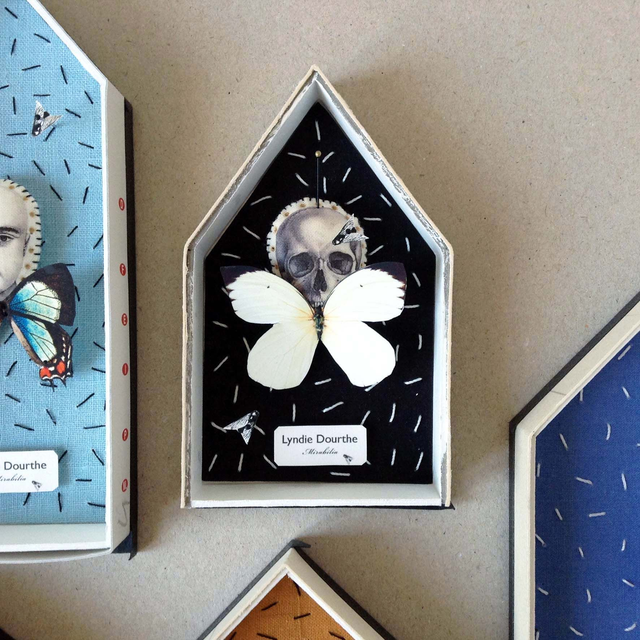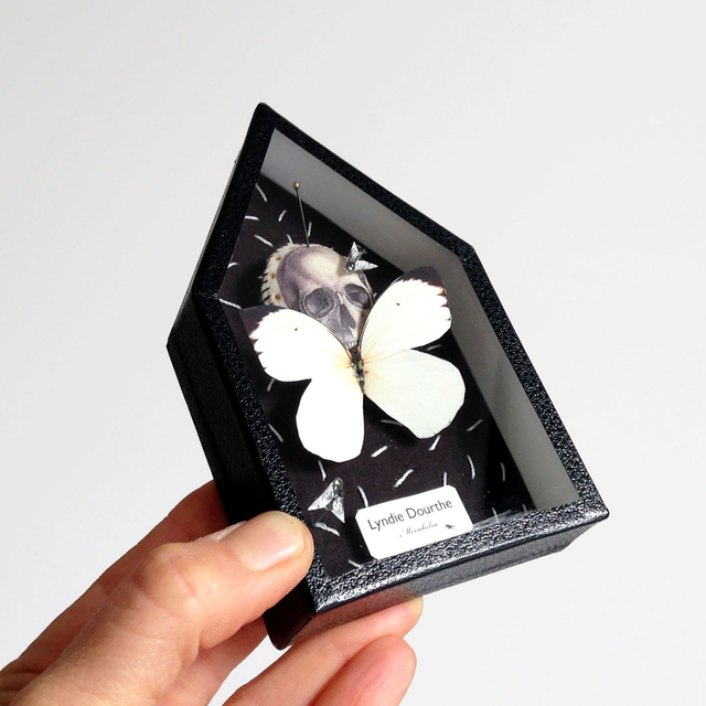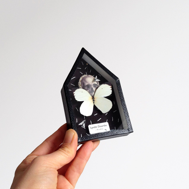 Pièce unique présentée dans une boîte décorative vitrée en carton, recouverte de papier reliure noir, faite-main par mes soins.