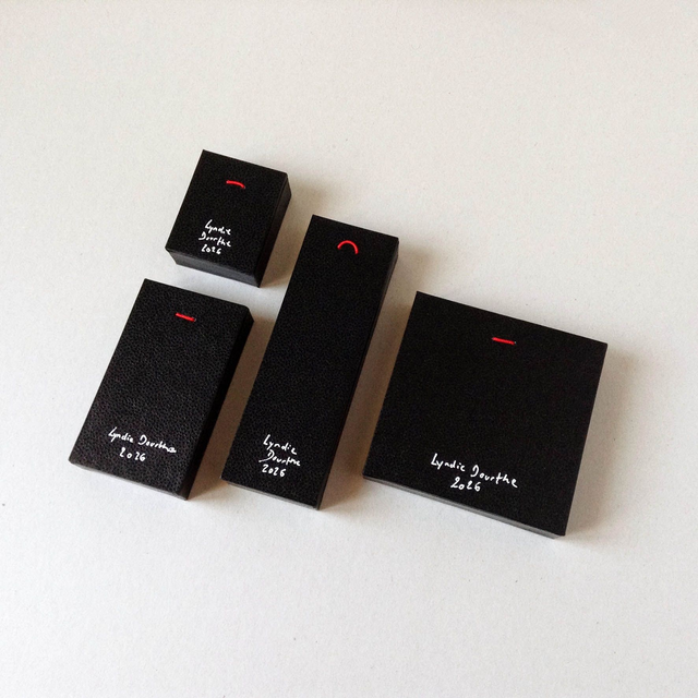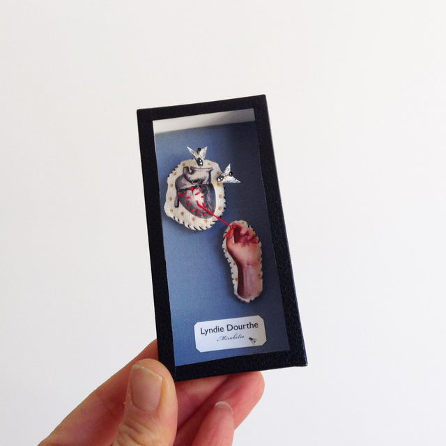 Pièce unique présentée dans une boîte décorative vitrée en carton, recouverte de papier reliure noir, faite-main par mes soins.