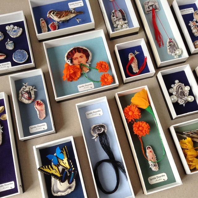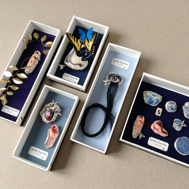 Matériaux : carton / verre / textile / épingles / fils.