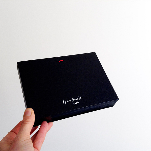 Pièce unique présentée dans une boîte décorative vitrée en carton, recouverte de papier reliure noir, faite-main par mes soins.