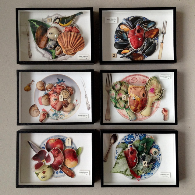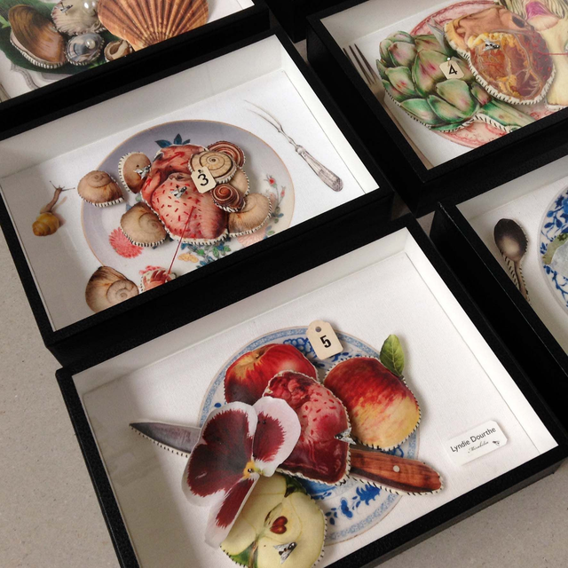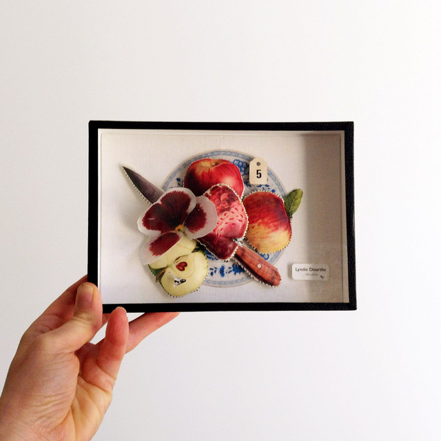 Pièce unique présentée dans une boîte décorative vitrée en carton, recouverte de papier reliure noir, faite-main par mes soins.