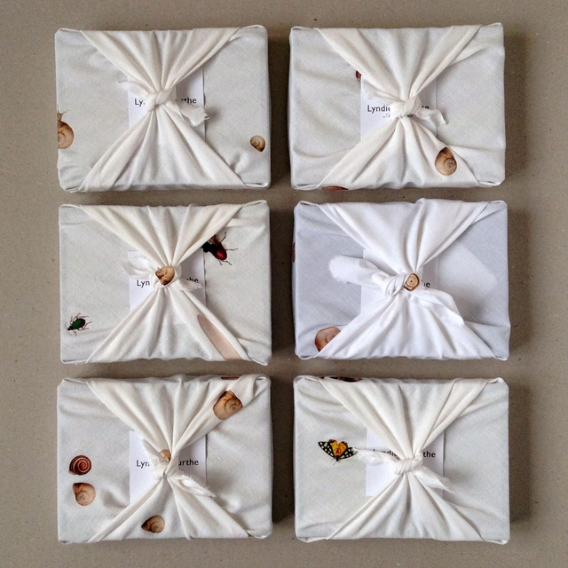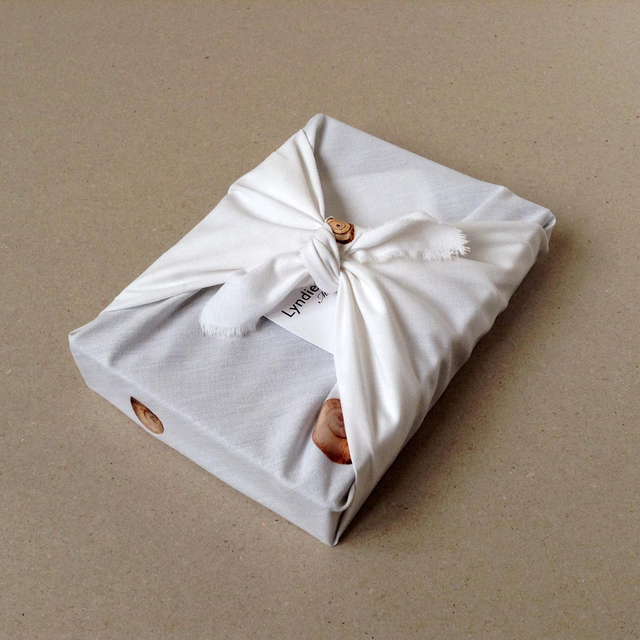Cette pièce est présentée dans un carré de coton blanc imprimé et noué à la façon d’un furoshiki.